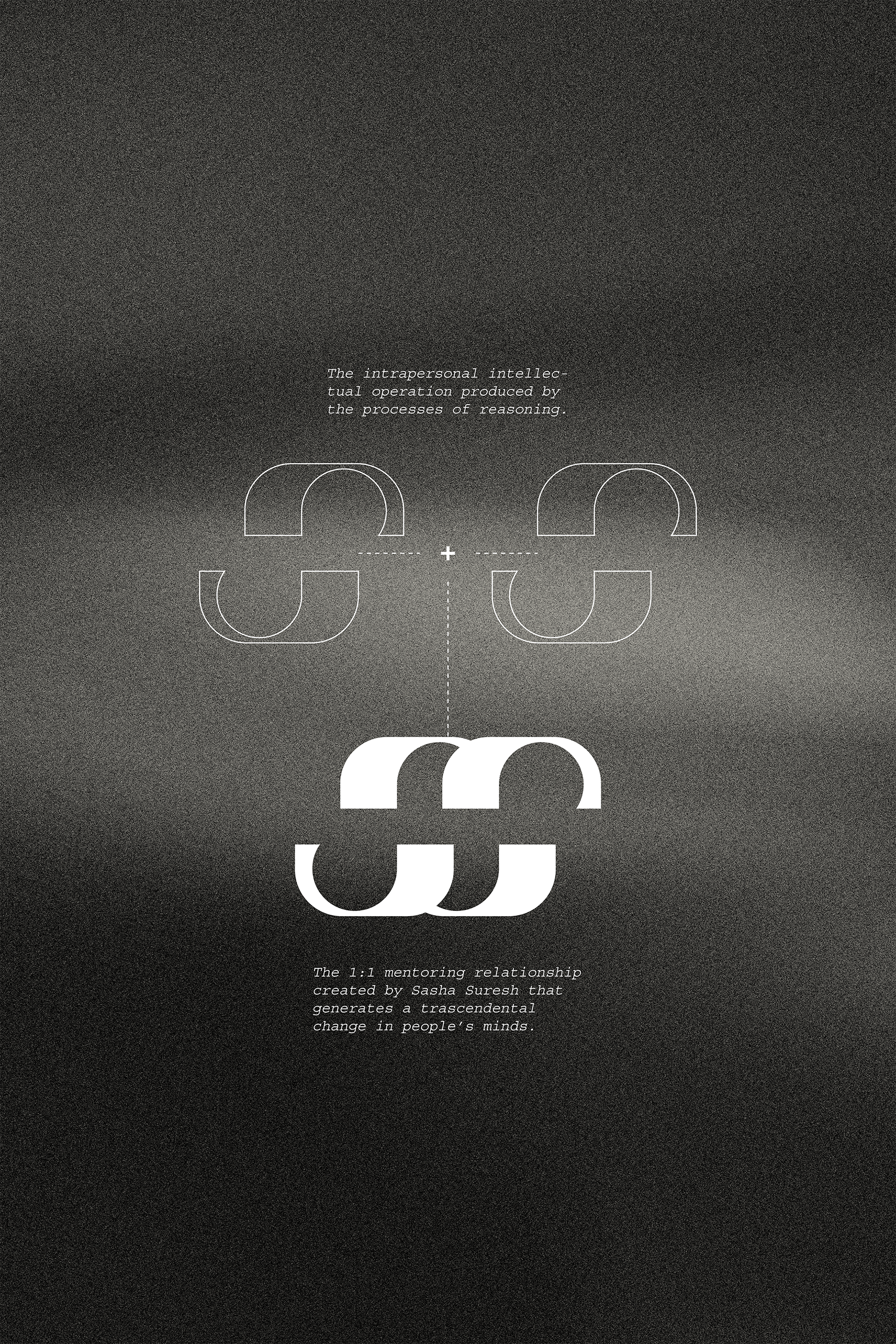 The construction of the isotype consists of a horizontal succession of circles that represent the intrapersonal intellectual operation produced by the processes of reasoning and generate the ways of thinking of each person. The union of the two letters into a single visual element represents the work of Sasha Suresh, which fulfills the function of creating a direct 1:1 mentoring relationship (more human and personalized) that generates a transcendental change in people's minds.