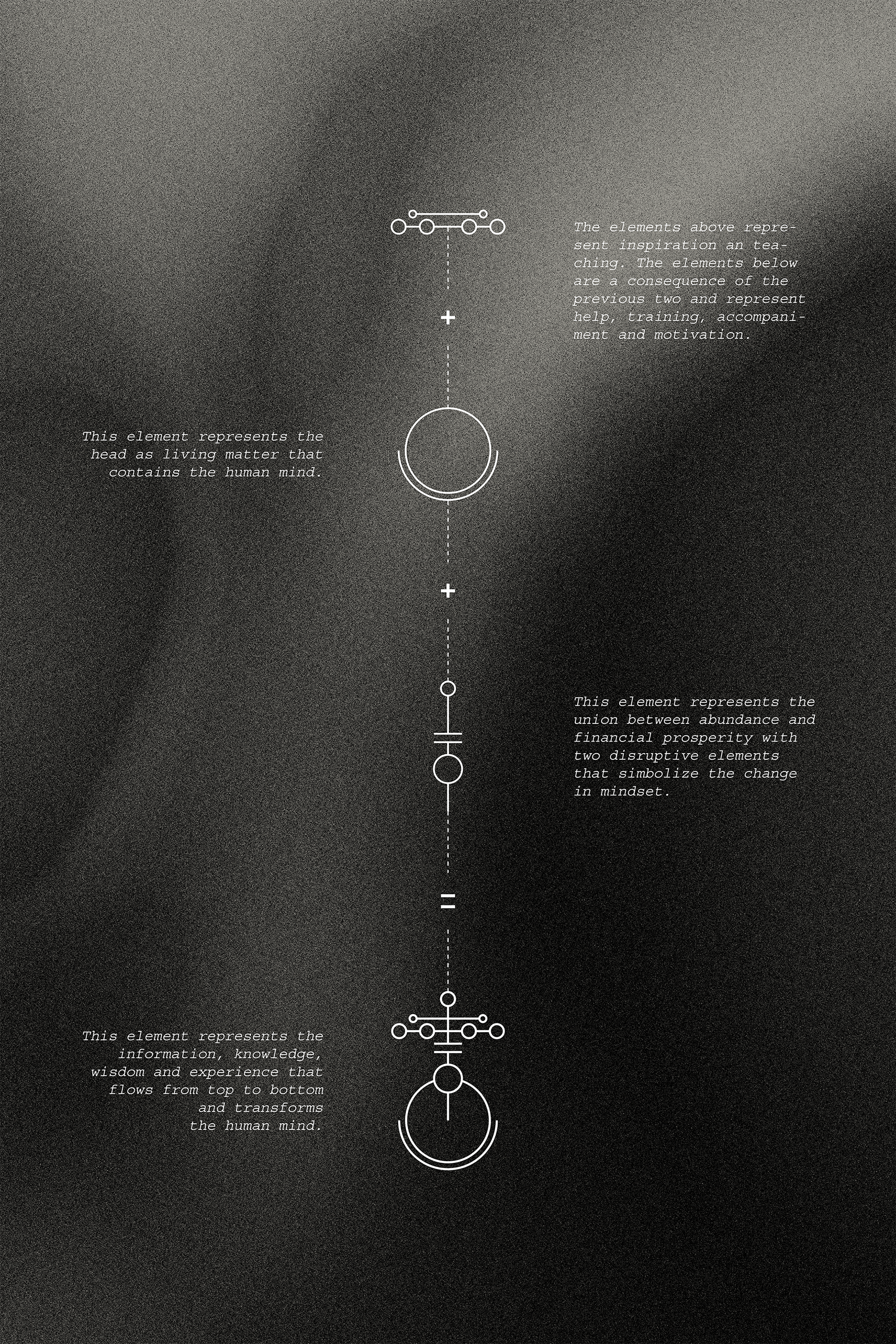 Inspired by the symbolic elements of this philosophical discipline, I was able to create an isotype that encompasses the whole process of changing a person's mentality through a new consciousness. The first element represents 6 concepts that are the set of actions that generate the work of Sasha Suresh: first, it begins with inspiration and teaching; and later she offers help, training, accompaniment and motivation. The second element represents the head as a living matter that contains the human mind. The third element represents the union between abundance and financial prosperity with two perpendicular disruptive elements that symbolize precisely the change in mindset. All elements together seek to embody the information, knowledge, wisdom and experience that flows from top to bottom and transforms the human mind.